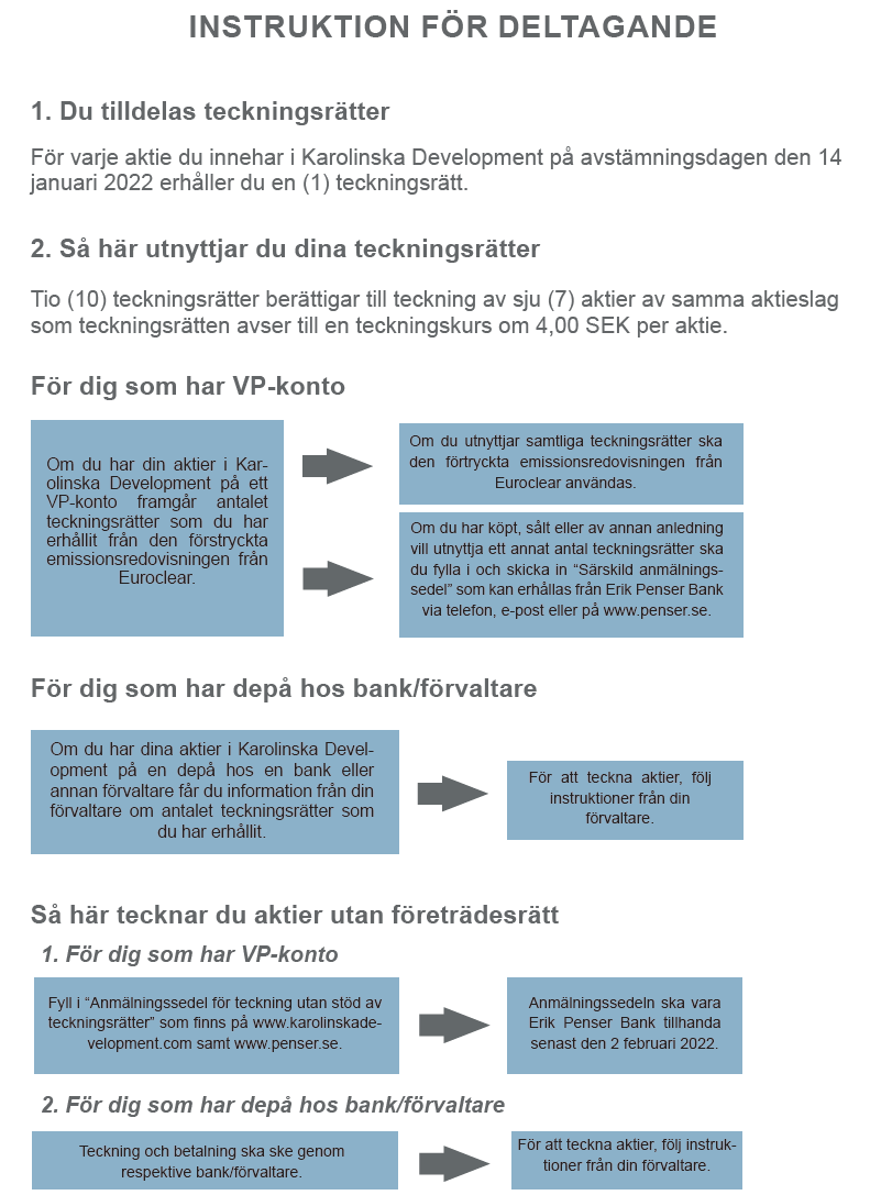 Informationen på denna del av Karolinska Developments webbplats riktar sig inte, direkt eller indirekt, helt eller delvis, till personer som har hemvist i eller vistas i USA (innefattande dess territorier och provinser, varje stat i USA samt District of Columbia, (”USA”)) eller någon provins eller något territorium i Australien, Hongkong, Japan, Kanada, Nya Zeeland, Schweiz, Singapore, Sydafrika, Sydkorea eller annan jurisdiktion där erbjudande eller försäljning av värdepapper utgivna av Karolinska Development inte är tillåten. Informationen på denna webbplats får inte offentliggöras, publiceras eller distribueras, direkt eller indirekt, inom eller till USA, Australien, Hongkong, Japan, Kanada, Nya Zeeland, Schweiz, Singapore, Sydafrika, Sydkorea eller annan jurisdiktion där sådan åtgärd skulle vara olaglig, föremål för legala restriktioner eller kräva andra åtgärder än de som följer av svensk rätt. Informationen får inte heller vidarebefordras, reproduceras eller uppvisas på sätt som står i strid med sådana restriktioner eller skulle innebära sådana krav.