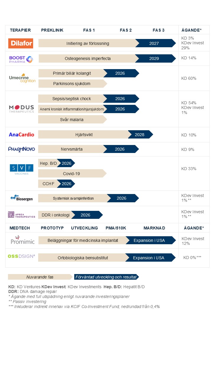 KDventures har en fokuserad portfölj bestående av läkemedels- och medicintekniska bolag med betydande möjligheter till värdeskapande. Portföljbolagen utvecklar högt differentierade och kommersiellt attraktiva produkter med potential att leverera både övertygande kliniska och hälsoekonomiska fördelar, liksom attraktiv avkastning.