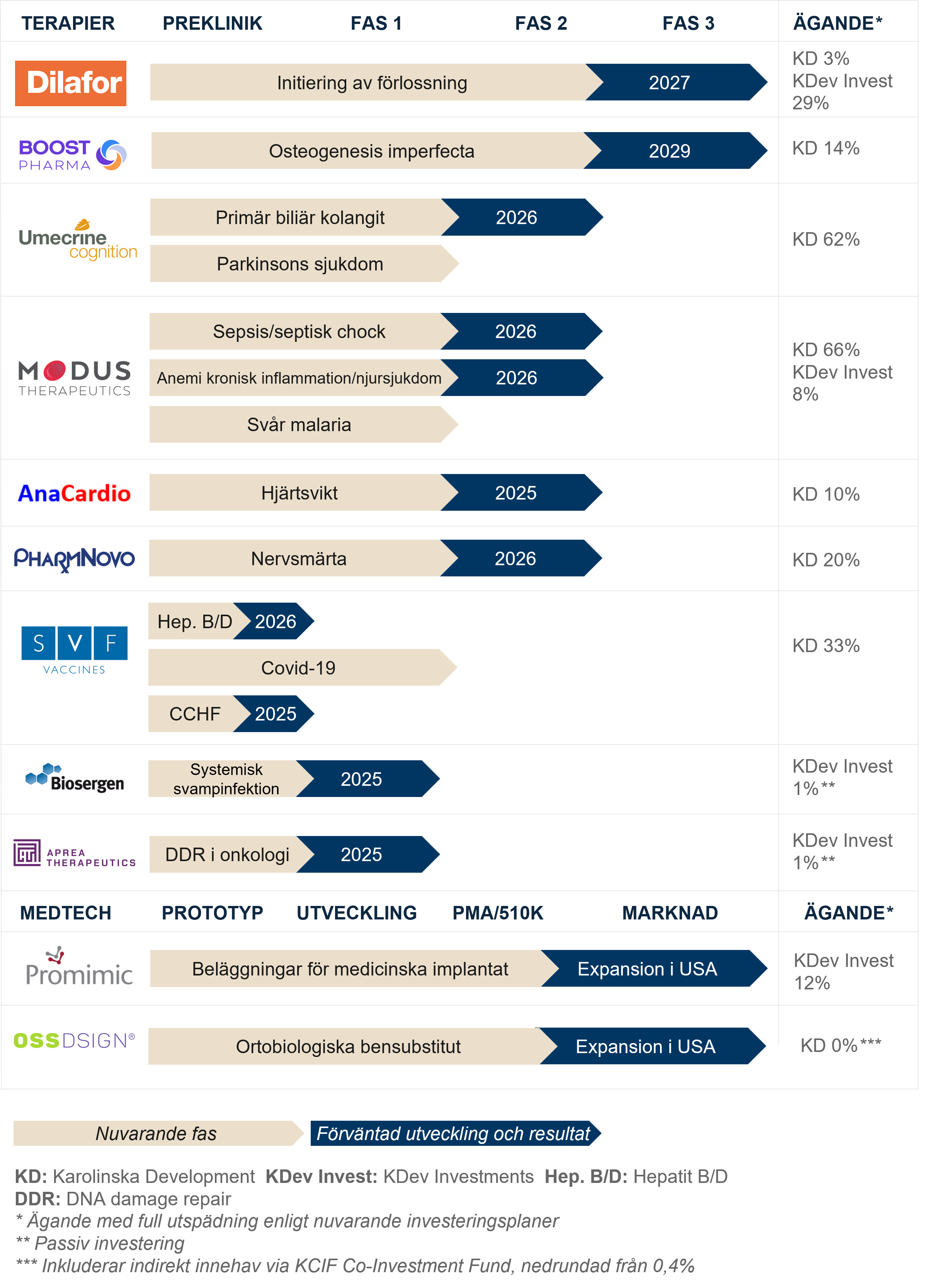 Karolinska Development har en fokuserad portfölj bestående av läkemedels- och medicintekniska bolag med betydande möjligheter till värdeskapande. Portföljbolagen utvecklar högt differentierade och kommersiellt attraktiva produkter med potential att leverera både övertygande kliniska och hälsoekonomiska fördelar, liksom attraktiv avkastning.